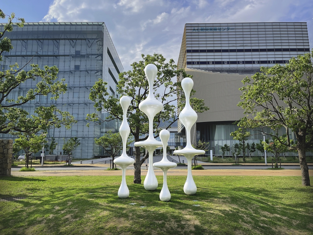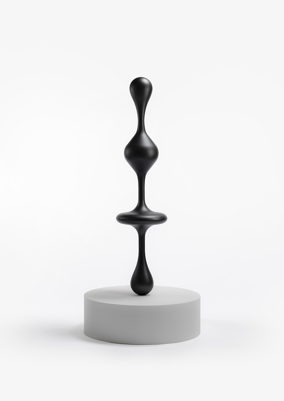 《Ether》は、粘度の高い液体が床に落ちるさまざまな段階の形状を3Dモデル化した彫刻作品。雫の写真や、粘度の高い液体を流して観察し、液体の表面張力における弾性を描きながら、その形状をトレース。得られたシルエットを3D上で回転させ、上下反転させたものを合わせ、その形状をランダムに積み重ねる。「無限柱」のように屹立するこの彫刻は、重力と無重力の反作用の関係性によって、無重力の仮想状態を作り出すよう設計されている。
