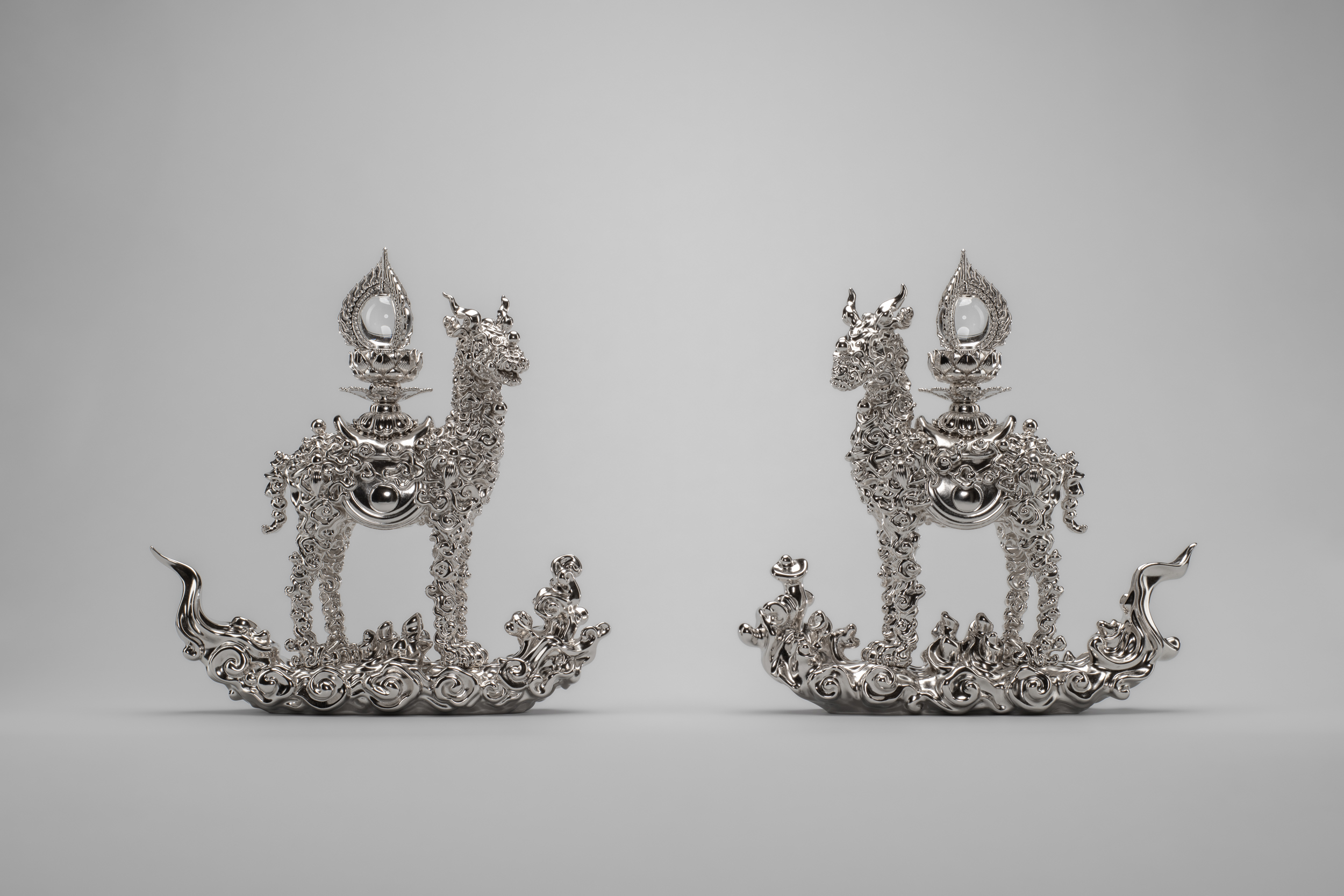 The deer rises from Okinawa’s Nanjo city, its body wrapped in forms reminiscent of thermal currents, its antlers flickering like the tips of rising flames. Draped in a luminous silver-pink, it stands in striking contrast with the dense greenery, resonating with the concentrated energy of Okinawa’s geography and culture.
