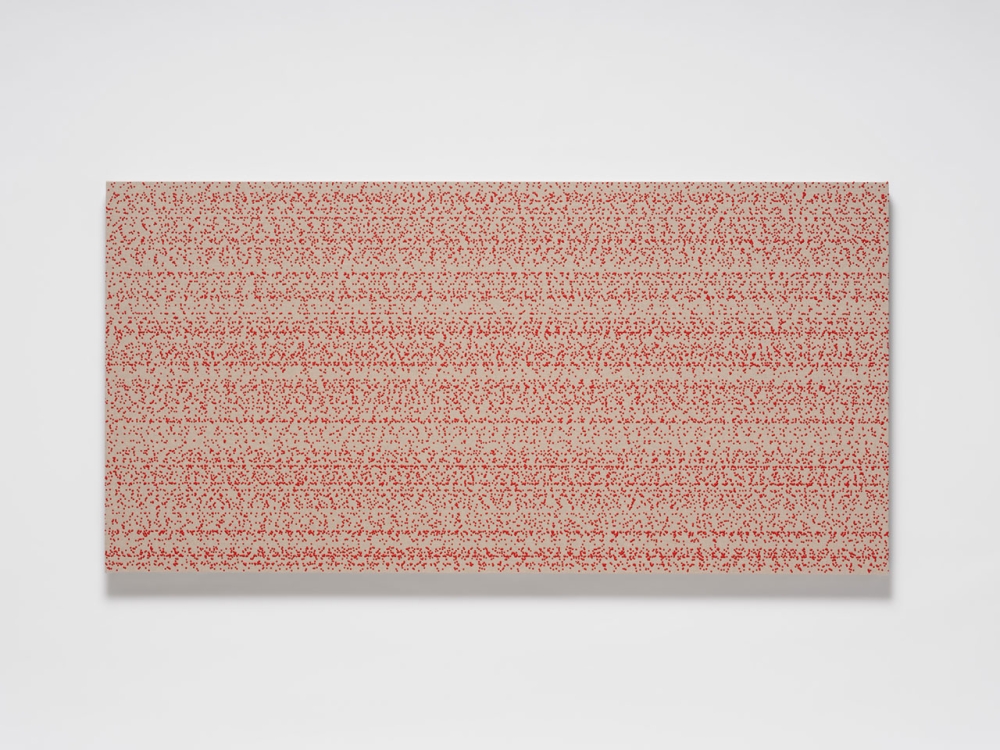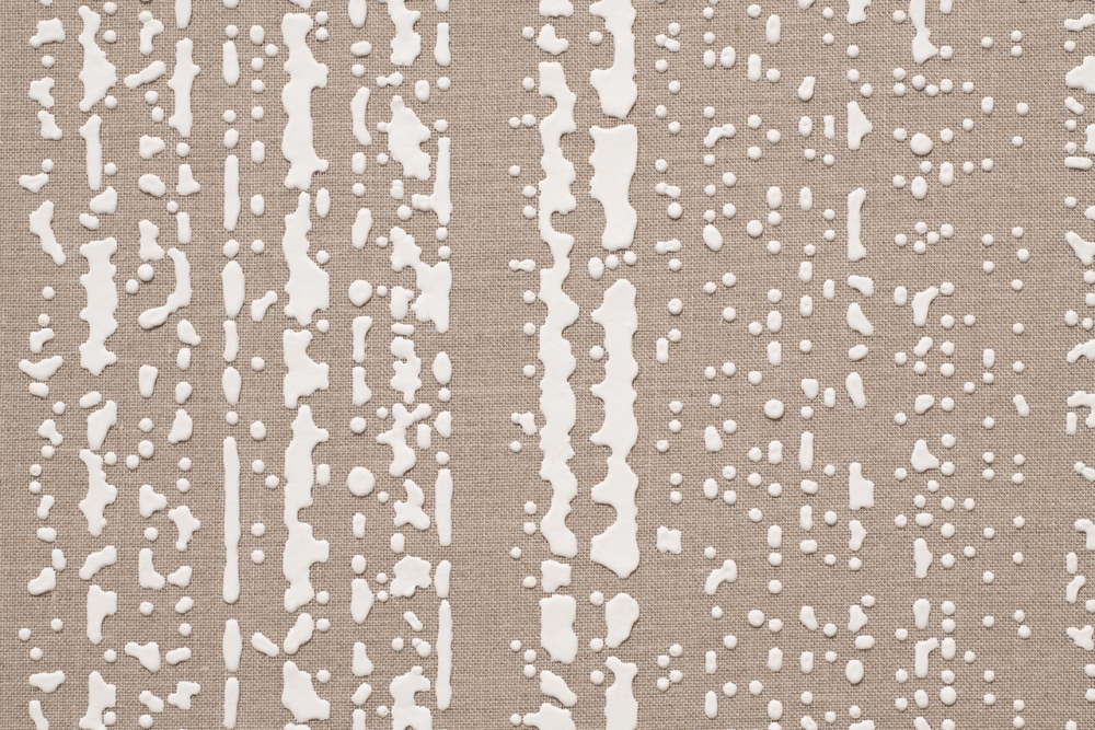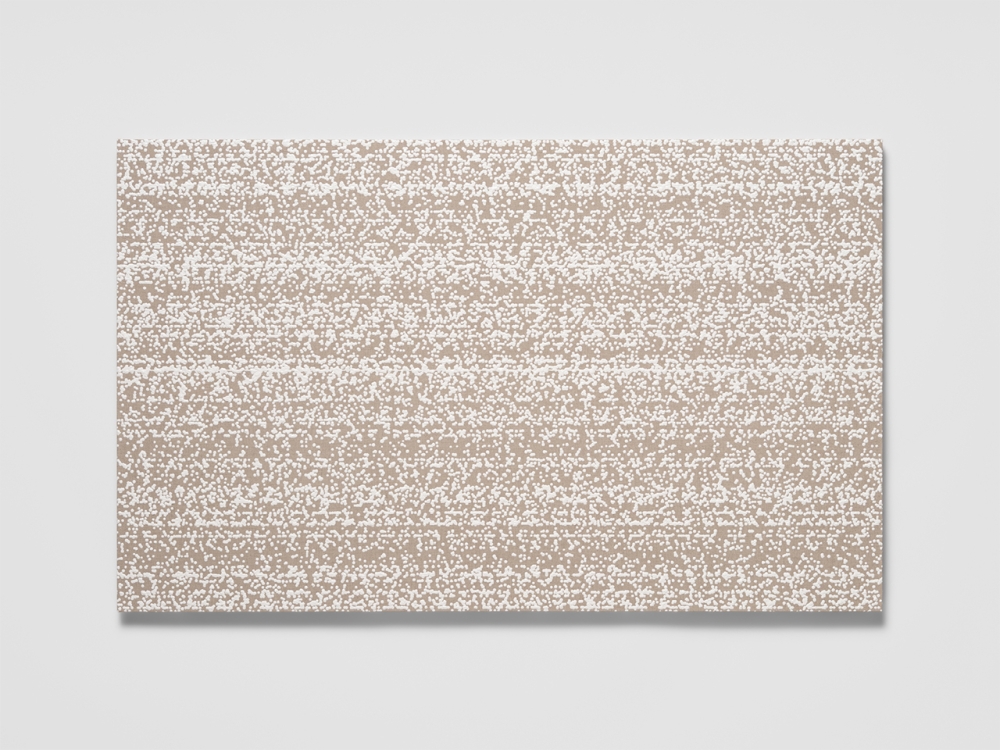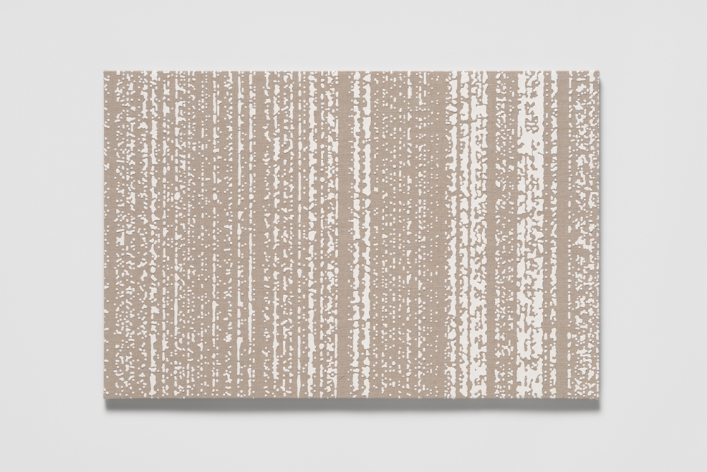 ”Code” works consist of pigment of suitably modified viscosity dripping onto a support traveling at a leisurely 1cm/second. The blobs of paint coming into contact with the rough linen surface occasionally spread and connect to each other, morphing in random ways while retaining their volume. These rain-like arrangements of dots, reminiscent of the Morse code used in the early days of the telegraph, or program code running across a black and white screen, possess a material quality suggestive of a digital signal generated by an analog device, finding their presence between information and meaning joined by optic and haptic.